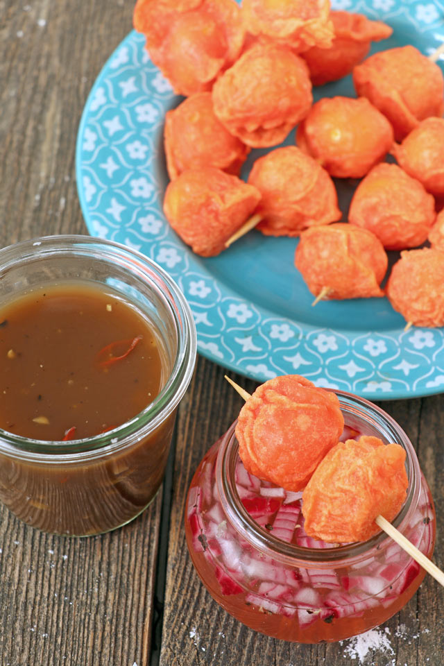 - Drop the floured quail eggs, one at a time into the orange batter and using a fork or a barbecue stick, turn them over to cover them completely with batter. Do this in batches, about 5-6 eggs per batch.